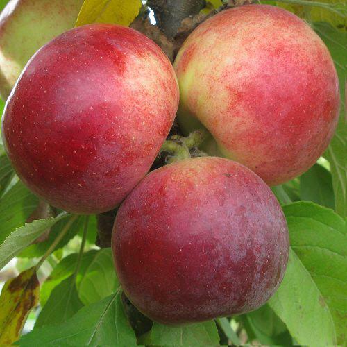 - Округлой формы, зелёного, с преобладающим красным покровом, цвета. Мякоть приятная и сочная, белого цвета;